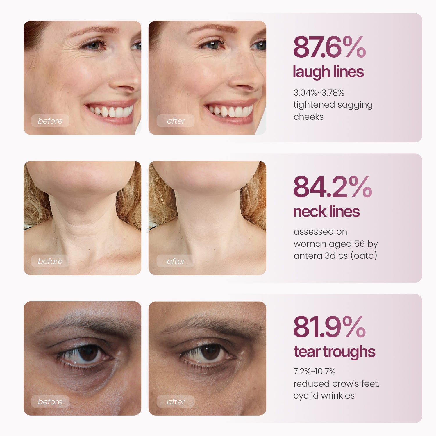Affeny is formulated with calcium, collagen, and peptides that work together to firm sagging areas, boost elasticity, and smooth away early signs of aging - perfect for under-eyes, smile lines, neck, or anywhere that needs soft, visible lifting.
